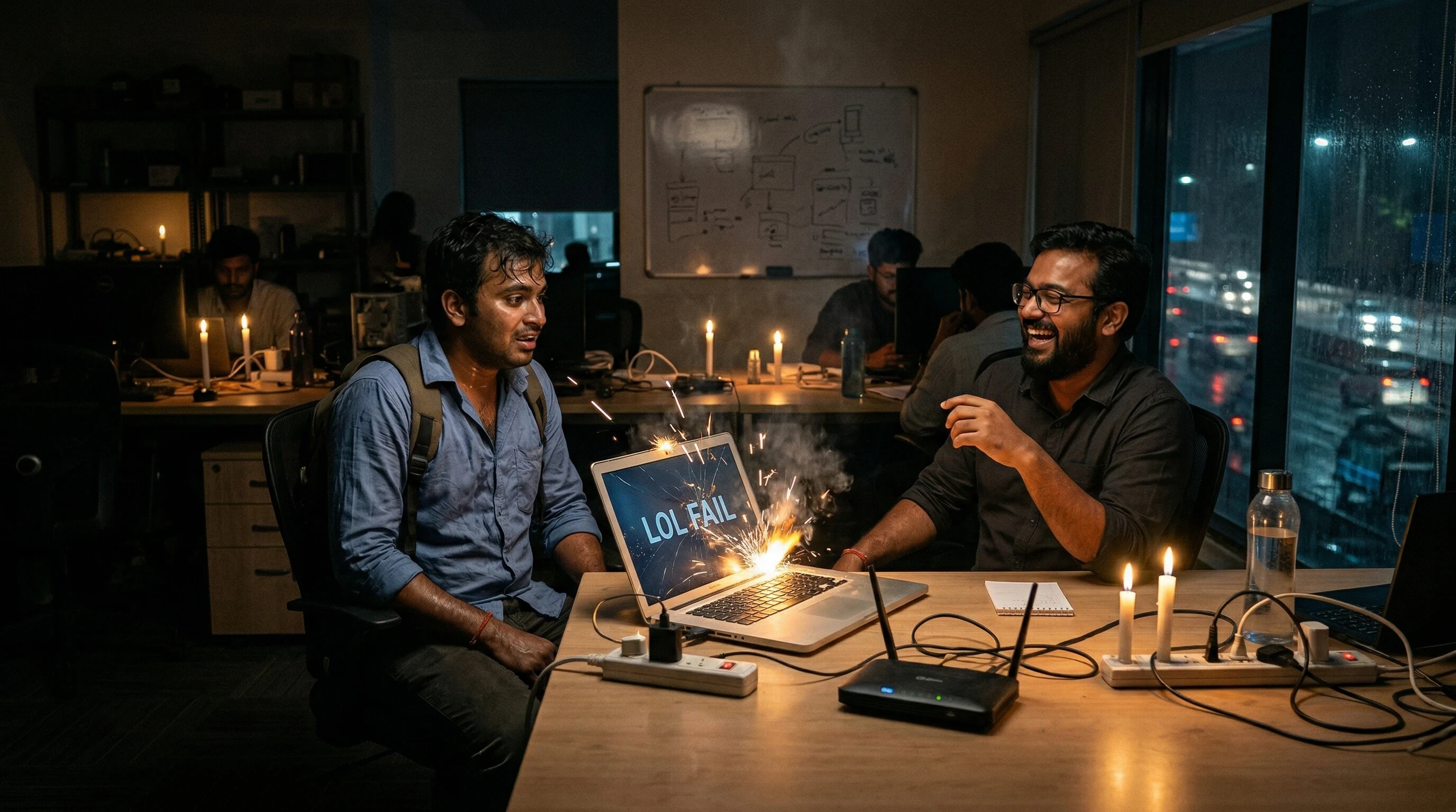 Job hunt: Bob interviewed at a tech startup in Whitefield. Traffic? Epic 2-hour crawl on Outer Ring Road. Sweaty, late, he arrives—power outage again! Interview in candlelight. "Tell me about yourself." Bob: "I'm Bob, king of LOL fails!" Demos his "skills"—laptop charger sparks, fries the router. Office goes dark. CEO laughs: "Hired! You fixed our boring meetings." Bengaluru truth: Whitefield traffic where bikes squeeze through like sardines, and sudden rains turn roads into rivers.