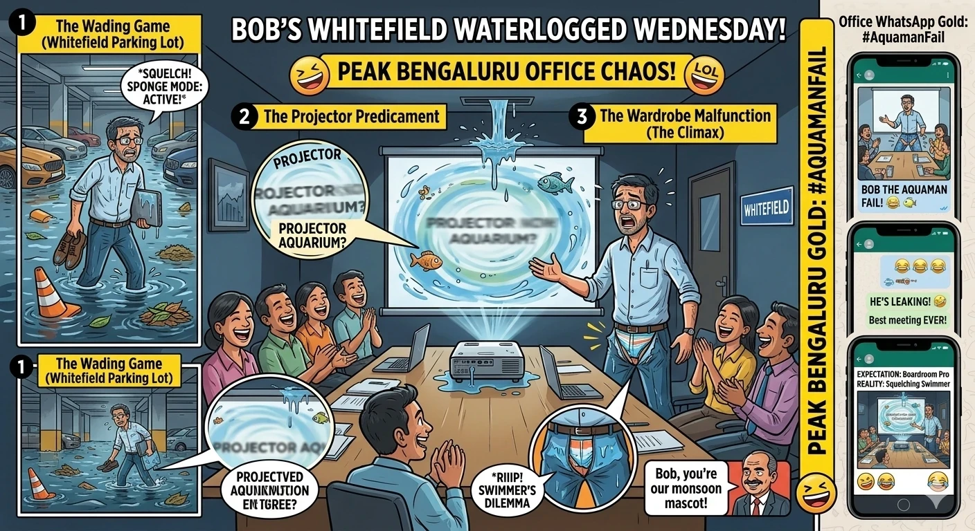 Office in Whitefield: Flooded parking. Bob wades in, shoes squelch like wet sponges. Meeting starts—roof leaks on the projector. Presentation? Blurry fish tank effect. Bob stands to talk: Pants split at the seam from the swim. Team roars. Boss: "Bob, you're our monsoon mascot!" Coworker shares pic: "Bob the Aquaman Fail"—office WhatsApp gold.