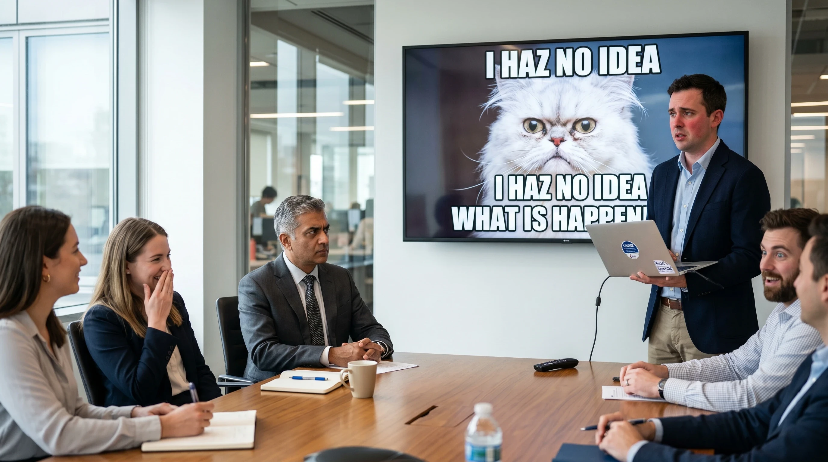 Mr. Sharma clears his throat and says, “Bob, this is your chance to show me that you’re valuable for this company. Pitch your idea now.” Bob stands up, heart pounding but smile wide. He opens his laptop, ready to blow everyone away with a brilliant presentation. He clicks the screen, ready to reveal his slides, and the machine freezes on a giant cat meme he forgot to close. The entire team stares at the screen in silence, and someone lets out a tiny snicker. Mr. Sharma raises an eyebrow and says, “Interesting strategy. Maybe the cat is your business partner?”