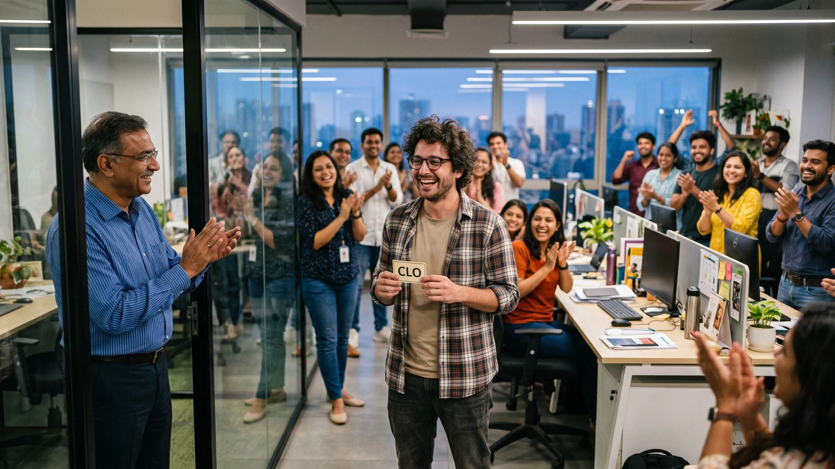 Days pass, and Bob’s strange but honest presence starts to change the mood in the office. Instead of a stiff, silent workspace, people begin to talk more, joke more, and feel more comfortable with each other. The client who once thought the office was too serious starts referring to it as a lively, creative place. Mr. Sharma calls Bob into his cabin one evening and says, “I must admit, Bob. You are not the typical employee we expected. Your ideas are messy, your moments are unpredictable, but somehow the team is happier than ever.” He pauses, then smiles and says, “I am promoting you – to Chief Laughter Officer.” The office erupts into cheers and Bob stands there, a little stunned, then bursts into a huge grin.