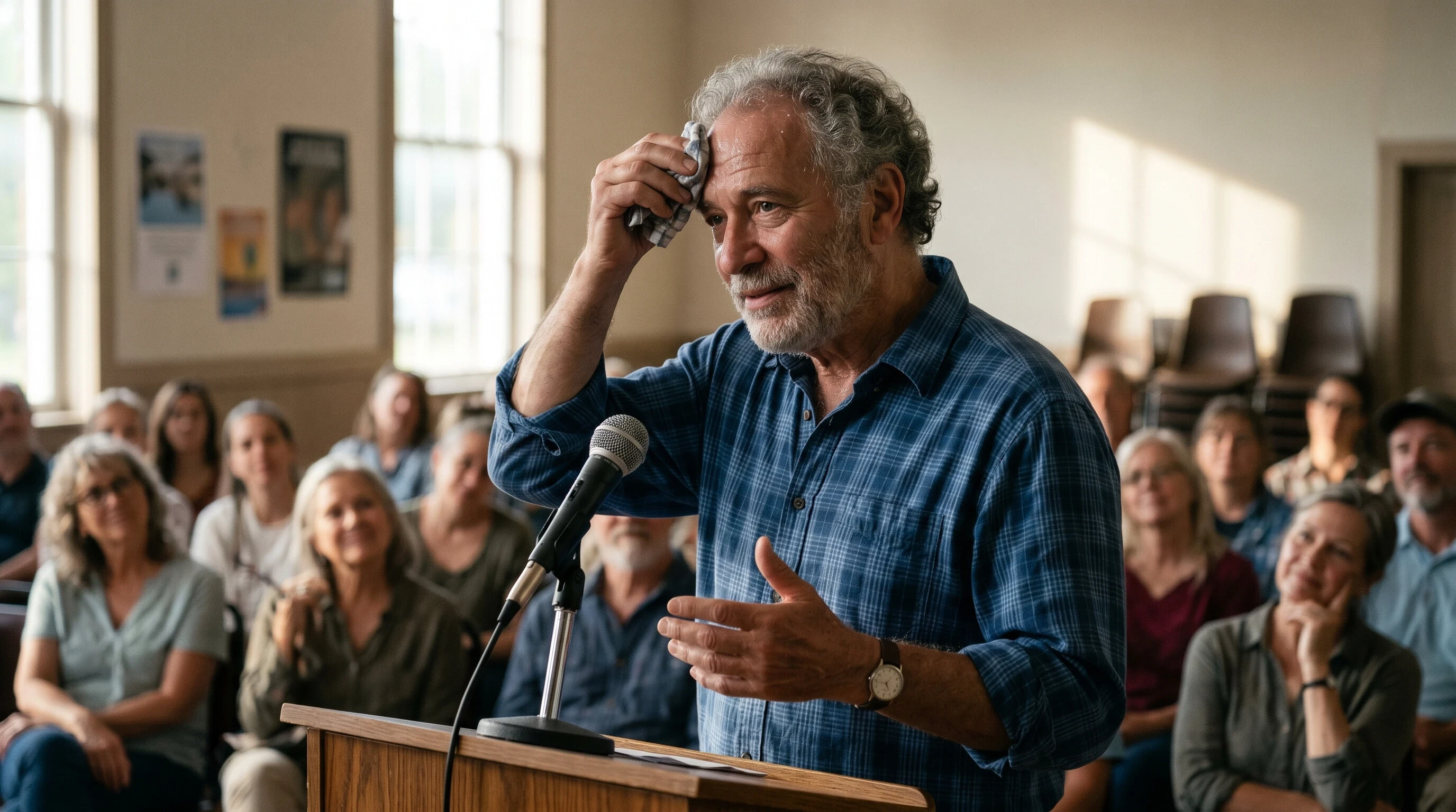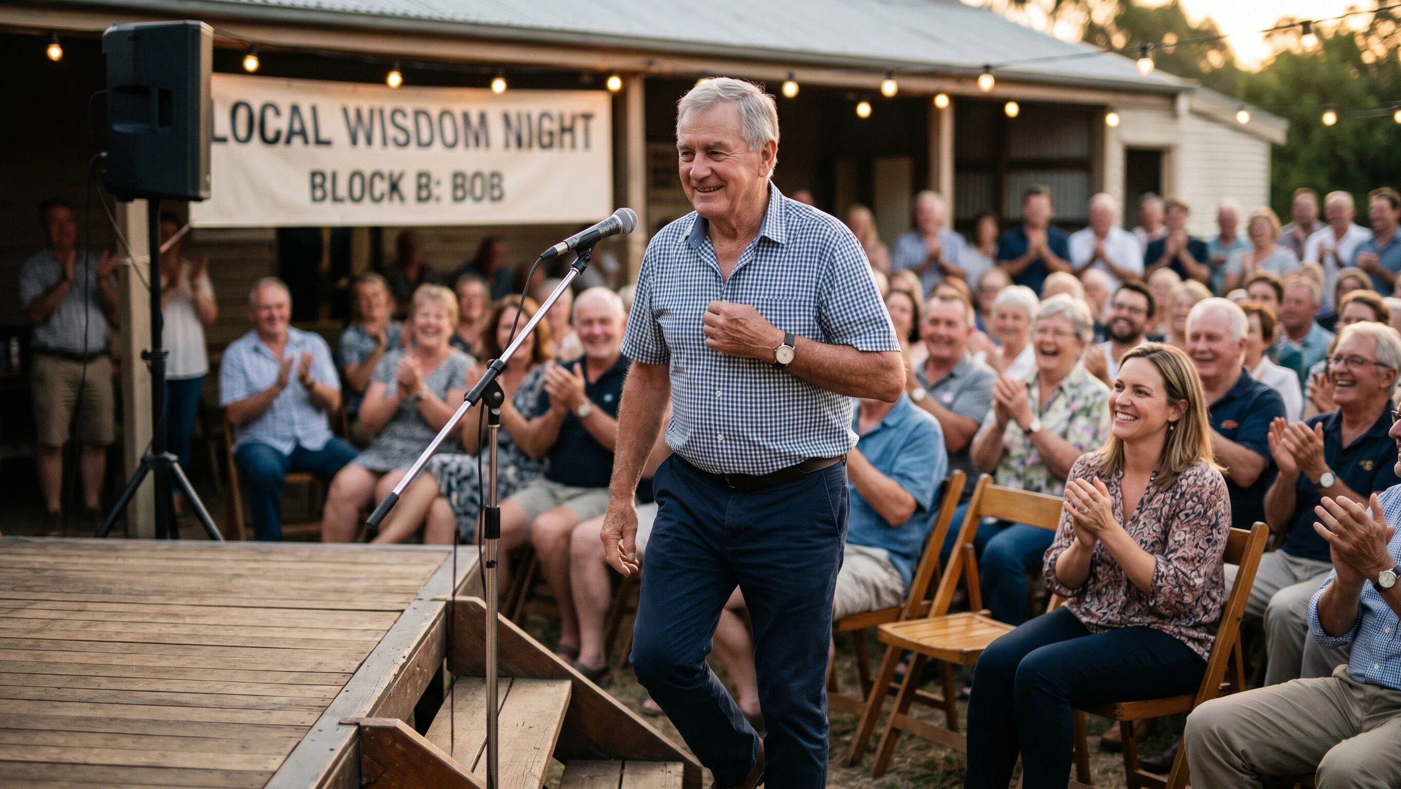 The organisers of the event have invited Bob to speak because he has become a bit of a local character. People enjoy his funny stories, his cheerful attitude, and the way he turns ordinary moments into jokes that make everyone smile. The loudspeaker announces, “Next, we have Mr. Bob from Block B with a wisdom speech!” Bob stands up from his chair, adjusting his shirt, and walks slowly to the small stage. The crowd claps, children giggle, and Jenny gives him an encouraging nod from the first row.