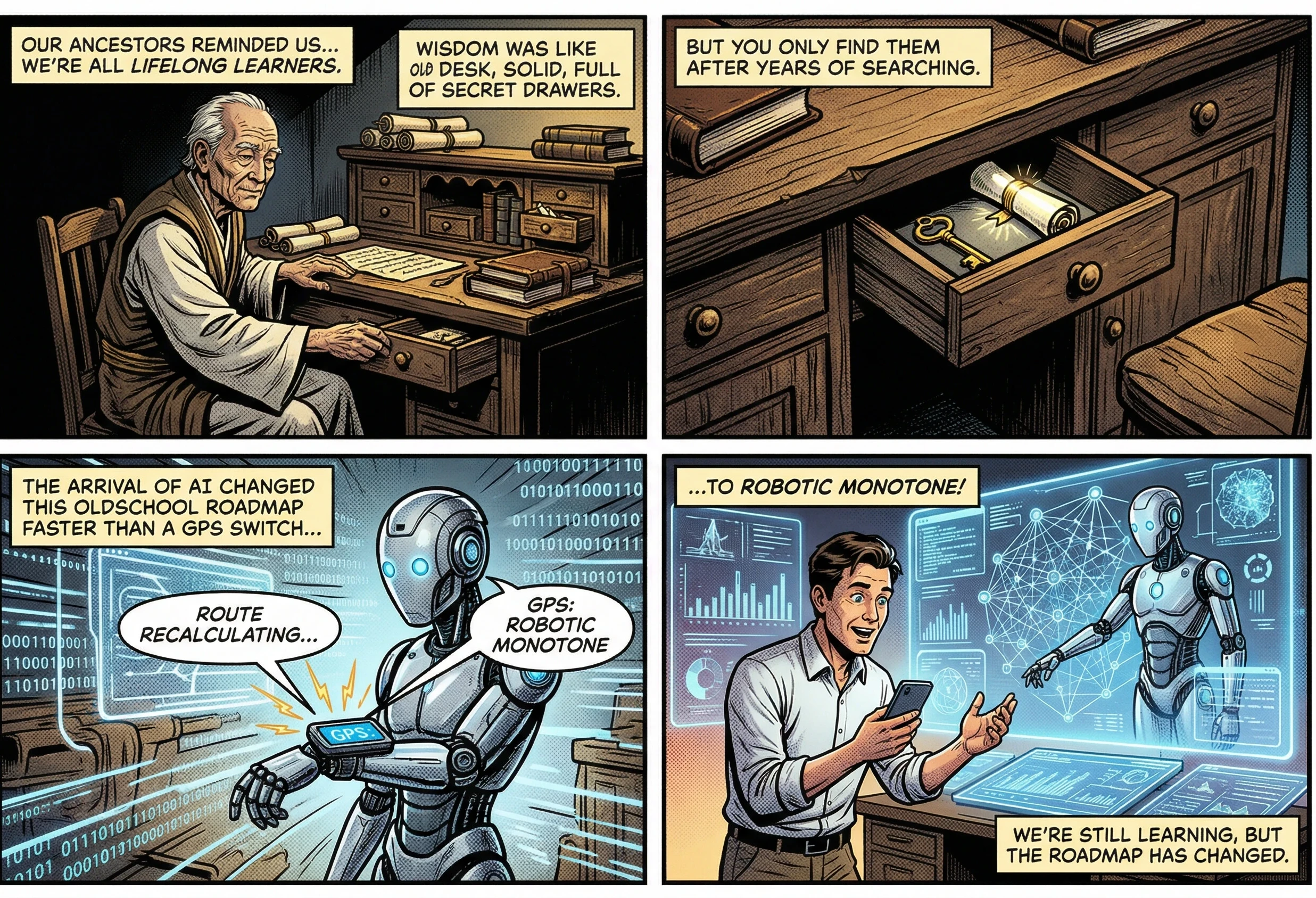 -My ancestors always reminded me that we’re all lifelong learners. For most of history, that meant listening to those with more wrinkles and gray hair. I always pictured wisdom as that reliable old desk in the corner, solid, a bit creaky, but full of secret drawers you only find after years of searching. The arrival of AI changed this oldschool roadmap faster than someone switching the GPS voice to "robotic monotone."