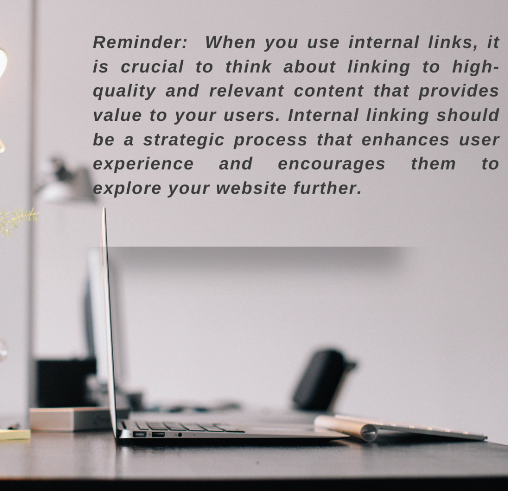 The photo inscription reads. Reminder: When you use internal links, it is crucial to think about linking to high-quality and relevant content that provides value to your users. Internal linking should be a strategic process that enhances user experience and encourages them to explore your website further.