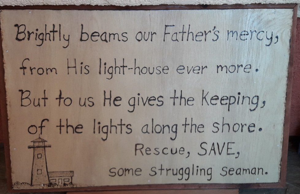 Sitting beside the lighthouse on the porch is a sign that I carved out to remind everyone who comes to our door and reads it that we all should be reaching out and helping others, just as our Maker helps and guides us.