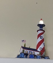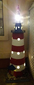 Having grown up on Islands, my wife also loves lighthouses. We have a rather large front porch, so she asked me if I could build a lighthouse to put there. I started out with a scale model (pictured below at the left) and got the lighting and beacon working the way I wanted before starting on the full-size version. This model now serves as a great conversation piece up on the ledge with other light houses, all wired to the same control switch in the living room.