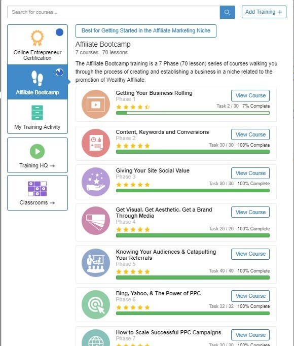 A significant part of the Wealthy Affiliate program is based on educating people about affiliate marketing. The training is carefully designed to help affiliate marketers, as well as other online entrepreneurs, build their online businesses. The official training is comprised of 120 lessons spread over 12 courses (or modules) which cover a wide range of topics.