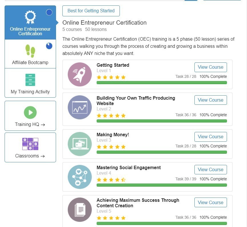 The Online Entrepreneur Certification (OEC) training is designed to create and grow an online business within any Niche you prefer. This training is broken down into five phases of ten lessons each. Each lesson consists of text and video where necessary. The five phases are shown on the chart below.