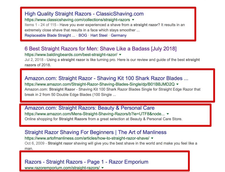 The ones I've highlighted in red squares are eCommerce stores. They aren't reviewing razors, they physically sell them.