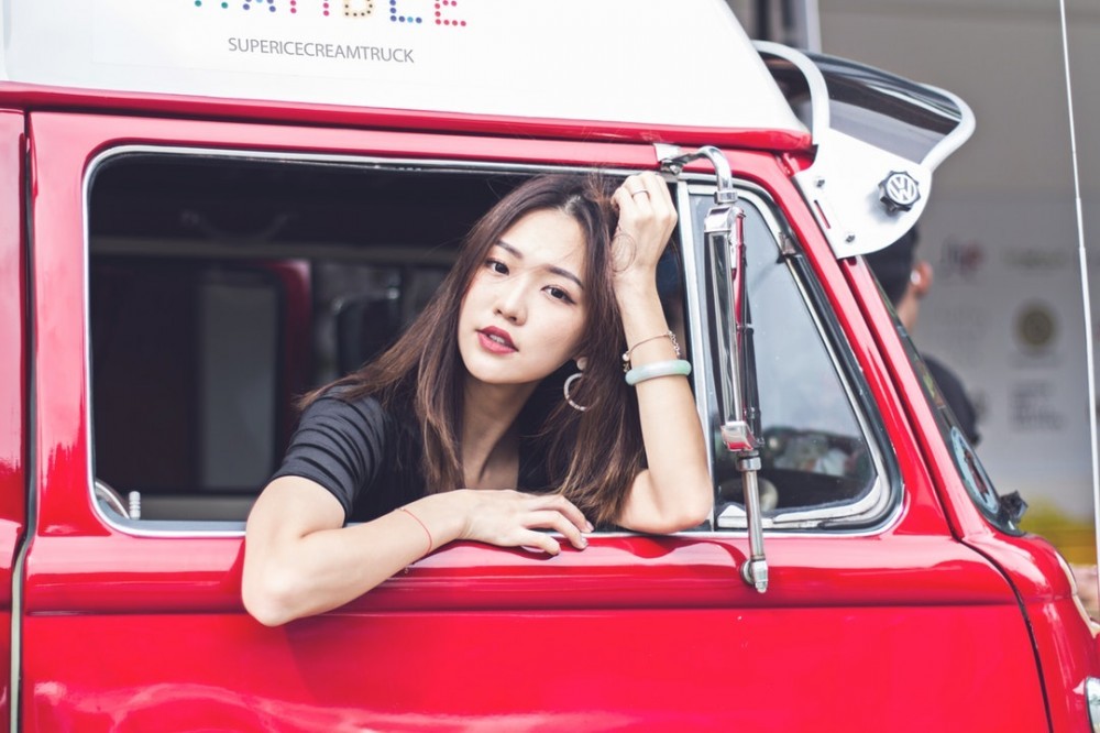 The driver of the truck approaches another red signal light and the girl catches up with him again!