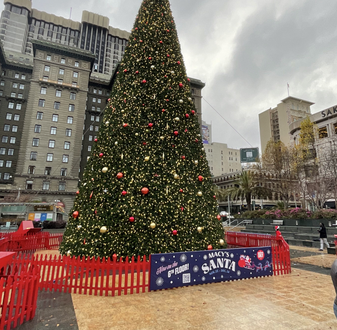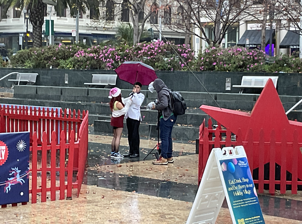 Today here at Union Square in Downtown San Francisco, second Saturday of the month kicks off their Annual drunk Santa Day. And even though we got major winds and rain, we still got some Mr. and Mrs. Santa coming out.