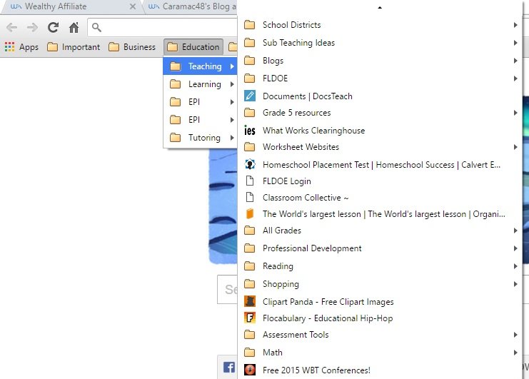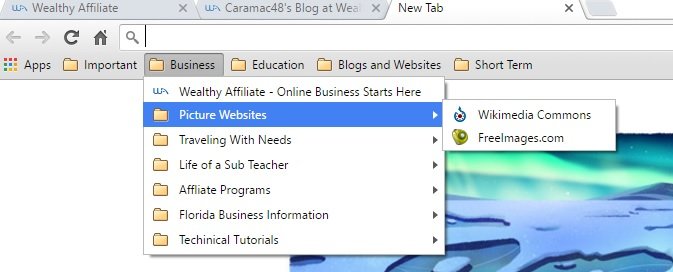 Then of course with WA and creating my websites I had lots of websites all bookmarked in no logical order related to creative commons pictures, affiliate programs, WordPress, and social media to name a few as well. Plus watching the training I would get frustrated with myself as Kyle's browser was so organized in the videos. (Kudos to you Kyle).
