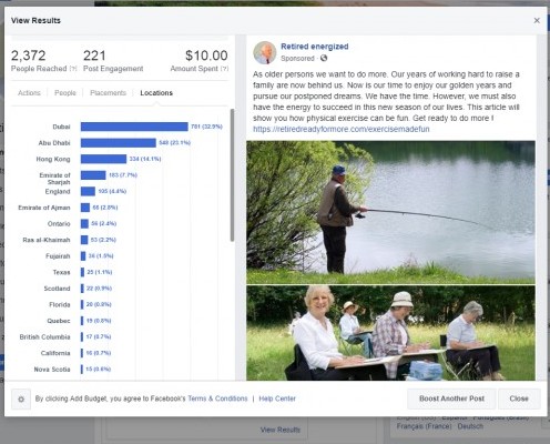 I had selected the USA,Europe and the Middle East but did not expect the positive response from the Middle East ,especially Abu Dabhi and Dubai.I want some of that oil money (lol). I need to learn now about ads in Facebook.I am not sure what is the difference between an ad and boosting a post. I do not know what algorithms Facebook use to select the viewers for the promotions.Thank you for your comment.