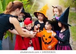 Children do dress up in costumes and go trick or treating in areas near American military bases, but most children's activities are parties that do not involve such scary costumes. Halloween activities are celebrated by adults at costume parties and night clubs. People carve pumpkins or display them as decorations, but not many houses have ghostly or ghoulish displays.