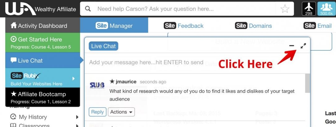 This makes it easy to stay involved in chat while working on your training, websites, or other aspects within WA! Just click on the Live Chat button and you can open and close the chat pop-out from the side. Click the Live Chat button again to hide, or click the "minus" icon in the top right hand side.