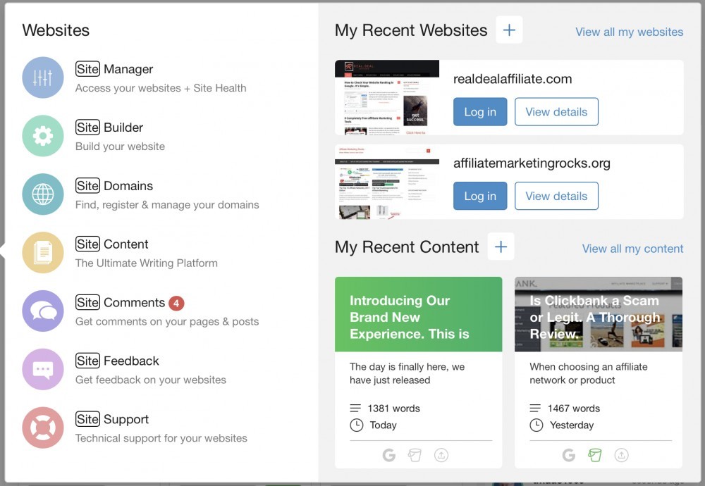 For example, within the Websites menu you can initiate the creation of a New Website, and a New Article right there. You can also log into your most recently used websites, and access your last updated articles in SiteContent (see image below).