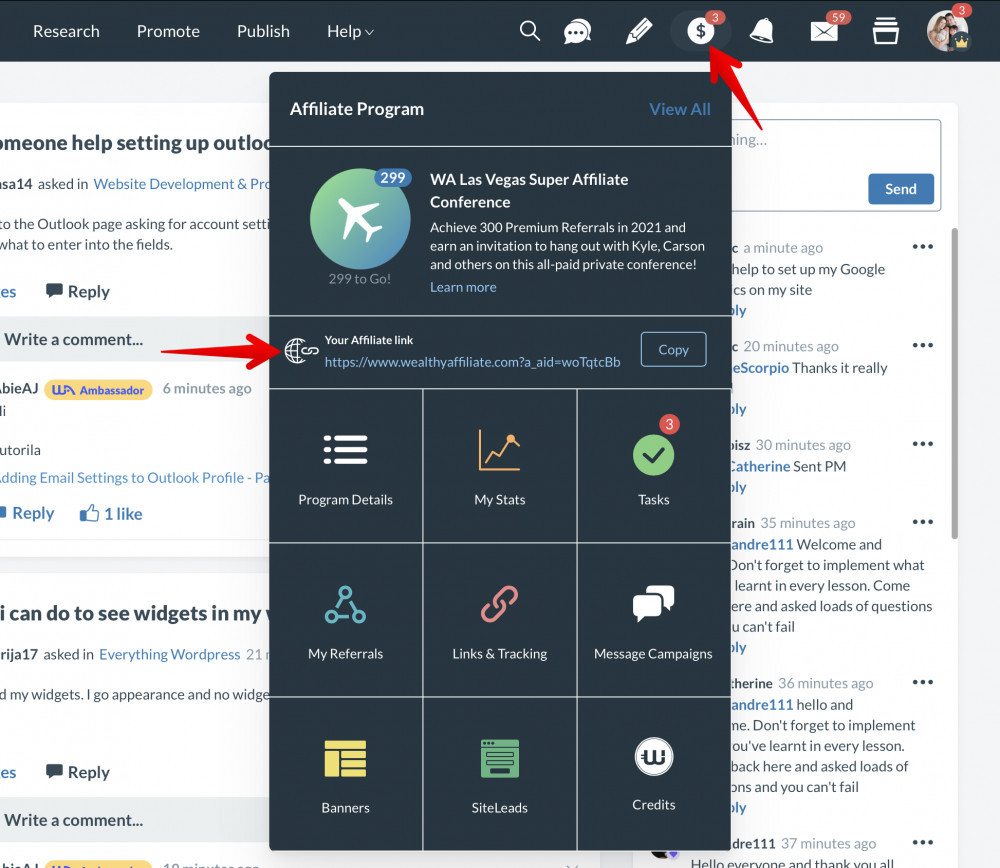 If you are actively recommending WA and sending people to the Wealthy Affiliate homepage, then you may notice an immediate improvements in conversions. For those of you that may not know how to send folks to the WA Homepage, you can find your link by clicking the $ sign icon at the top of WA. You’ll see your affiliate link right there!