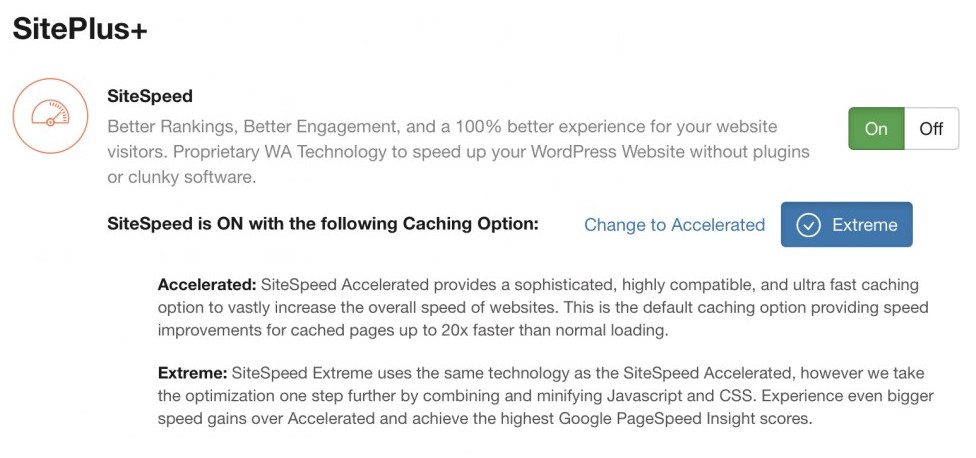 - Under the SitePlus+ section you will see a toggle switch which you can turn ON. Once it's on, choose Accelerated or Extreme speed options.