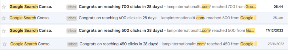 I was taken aback because only 10 days ago, on 25 January 2023, I got a similar message from Google saying I had reached 600 clicks in 28 days.