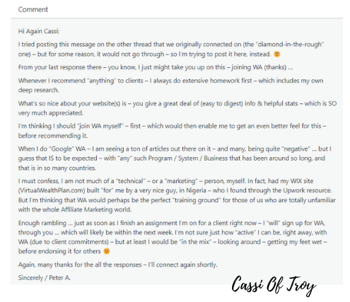 From Peter's comments, I have concluded that he is genuinely interested in learning about WA and recommending it as a passive income stream to his Clients.