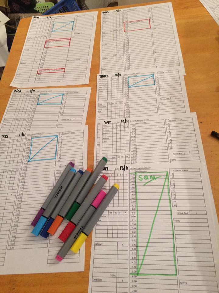 Below in the photo is my week. Well its not this week but this is a picture of how I plan my week. I have planner sheets that I print out each week and then I get my coloured pens out.