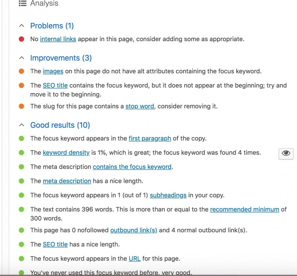 Focus keywords, readability, meta descriptions, internal links, outbound links, etc., etc.