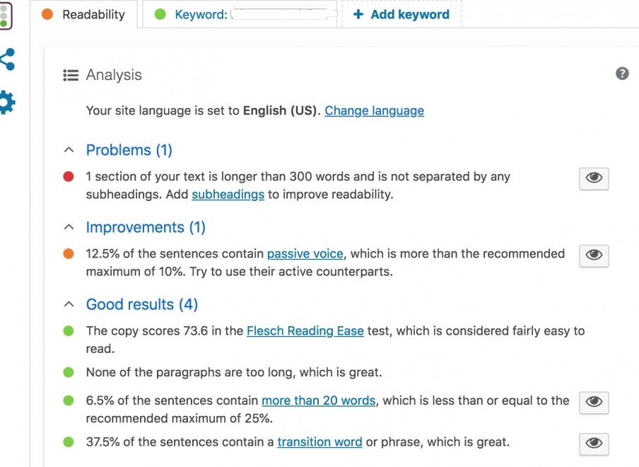I use the Yoast SEO plugin - the free version - and I don't know what I'd do without it! It evaluates my writing and tells me where the problems, what improvements I've made and what I've done right!