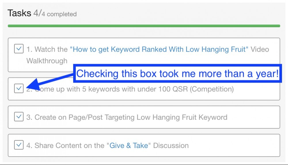 So, after talking to him, I was finally able to find the five low hanging fruit keywords I needed to finally check that box and progress with the course.