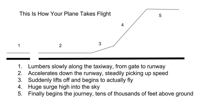All that "push back" and taxiing around, and paused, and just not getting anywhere. Then a few moments of acceleration in step 2 but "It's still not flying", and it's only covered a few hundred yards on a journey of several thousand miles.