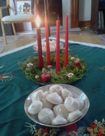 Daniela, 11, and I made the meringues which she loves and she decorated the table, put the cookies out, found the tablecloth, put on the candles and made the wreath.I helped by getting all the decorations out of the cupboard and supervising her baking effort.