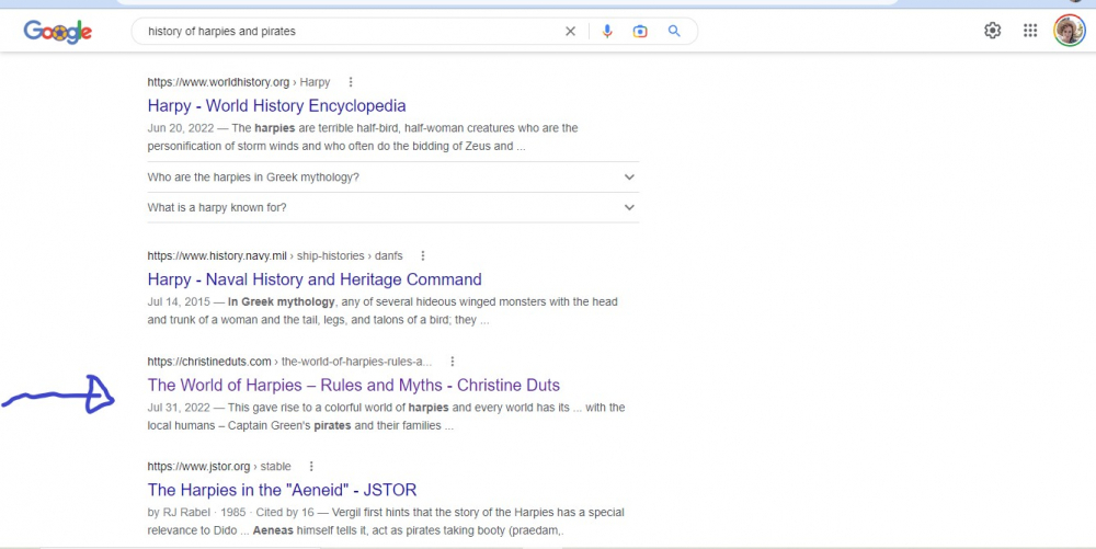 I just had to share this. I was doing some research for a new blog post I was planning, and so I typed into the Google search bar "history of harpies and pirates." I scroll down, trying to find some useful info and suddenly I come across my very own post! In position 7, right after a military history site :-)