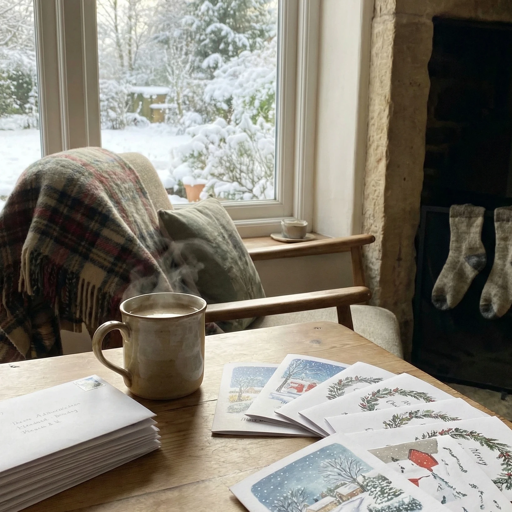 Coffee on the counter. Snow outside that still needs to be cleaned up from last night. A stack of Christmas cards waiting to be written and stuffed into envelopes. Nothing urgent—just life happening at a steady, comfortable pace.
