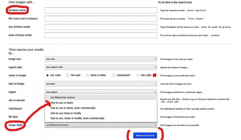 All you have to do is put in the keyword that you are looking for and then go down to the very bottom to the usage rights and pick "free to use or share." As a rule, I will give credit if there is one to give, and I always state 'free-image' in my alt text. I am not sure if that is correct, but that is what I do.