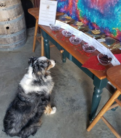 I had to share this photo of my dog, Timber, an Australian Shepherd that is excessively food motivated - but she is obedient. So here she is watching the chocolates - hoping some would jump off the table into her mouth, or one of my customers might drop a piece while they were tasting. She sat there for at least 10 minutes. Fortunately, she was not able to taste these delicious chocolates - (as we know chocolates are bad for dogs!)