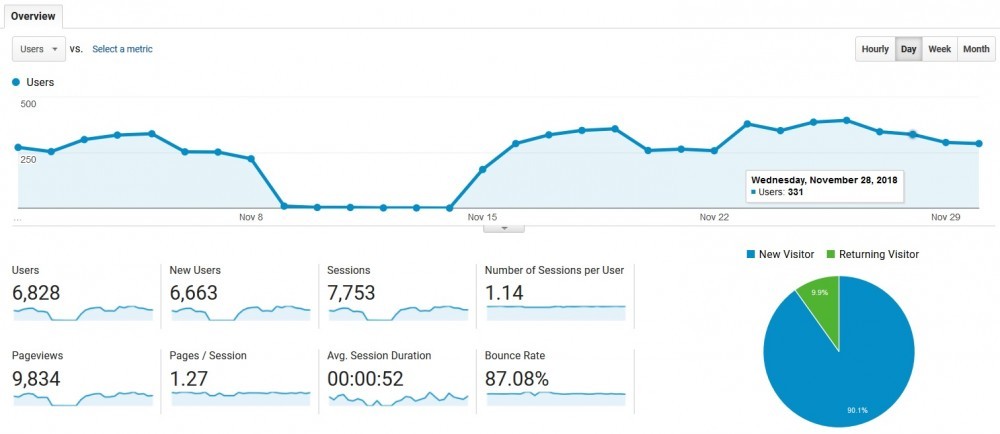From a Google standpoint I caught my error a little earlier. A theme update dropped all my header and footer code so when I first checked in I thought my site was down for a week. That's where you see that giant zero for a week straight. Woops. Either way, a great turnout this month!