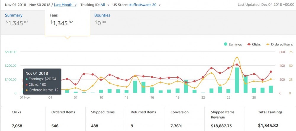 First and foremost, the money!I earned a total of $1,345 dollars from Amazon this month. The unfortunate part here is that I screwed up and accidentally dropped my Amazon OneLink code. This lost me A LOT of sales as I missed both Black Friday and Cyber Monday in every country but the USA. UGH! Either way, a great month: