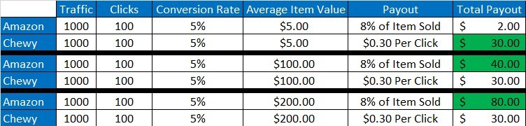 Amazon pays 8% per sale and Chewy pays $0.30 per click. See the table below for the payout differences of 100 clicks with a 5% conversion rate.