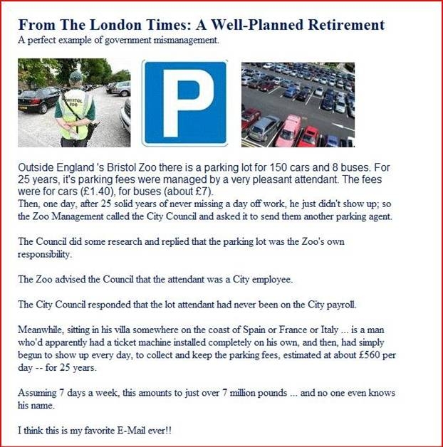 I figured something was up when the article got its basic maths wrong (only 2 million out) http://www.bristolpost.co.uk/Urban-myth-Bristol-Zoo-parking-attendant/story-11266383-detail/story.html not a true story alas!