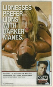 The small print at the bottom reads, "The results of a 30-year scientific study of lions in the Serengeti National Park of Tanzania show that lionesses are more attracted to darker maned beasts."