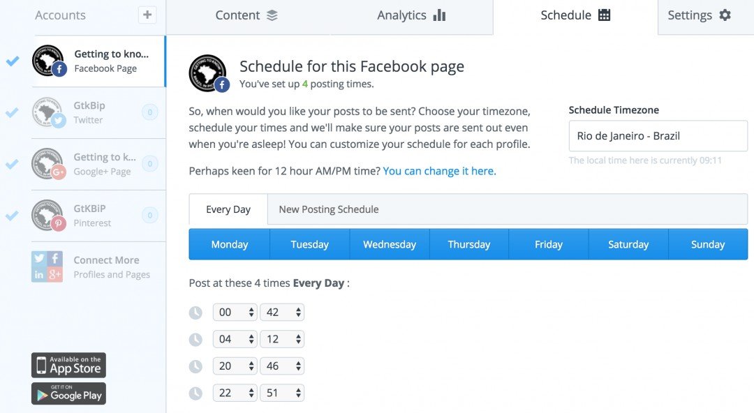 - Optimal - By selecting the number of times you want to post per day in a particular social media, it will calculate the ideal times based on engagement. Unless you have very specific necessities, this is the best option!