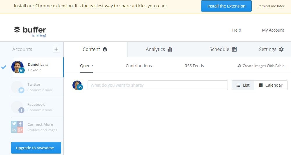 Even though there is a lot to explore on the dashboard, for now let's focus on the most interesting aspect of Buffer - its extension for Chrome. Unfortunately Buffer doesn't support other browsers yet. However, due to its integration with Google, I would recommend anybody creating and authoring content to use Chrome. I personally think it is a great browser anyway, so it shouldn't be such a hassle.
