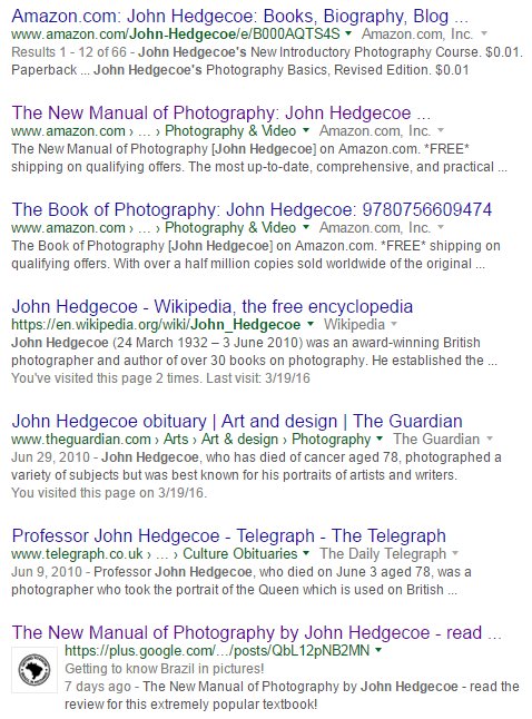 I have done a book review for "The Manual of Photography" by John Hedgecoe. This is a very popular book, and one that I knew would be hard to rank for. The keyword I have used is "John Hedgecoe". Please see below the Page 1 results: