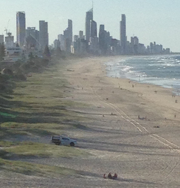 The skyline in the photo is Surfers Paradise here on the Gold Coast, the beach in the main photo is called Burleigh Beach.