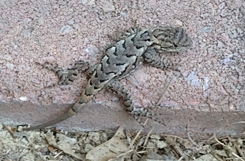 So as I sat at my table with the breakfast of champions……COFFEE, I looked out to see greenery growing out of the rock wall in my yard. I went out to take a photo of this greenery and was greeted by this little guy.