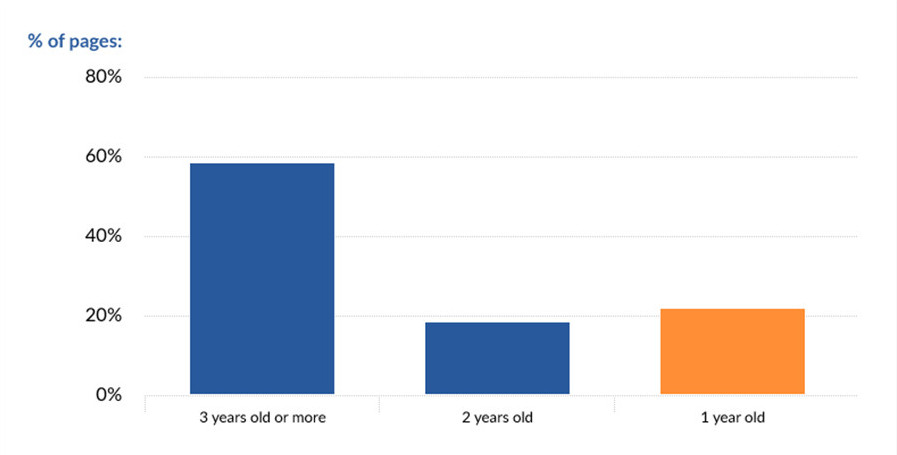 Further analysis discovered that only 22% of all pages discovered on page 1 of google were created less than a year ago and the average page age to reach the Top 10 search results for the keywords analysed were over 2 years old and, as mentioned position 1 was occupied by pages that are much nearer the 3 years old mark.