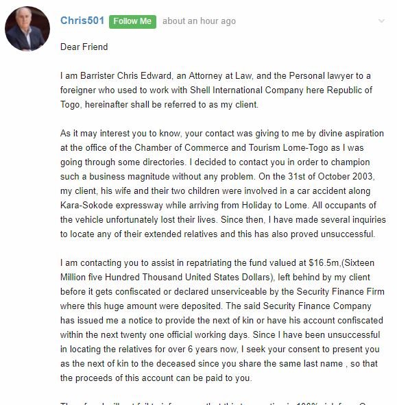 Hey David, this joker is going right for the classic Nigerian scam. What a moron! Wow!
