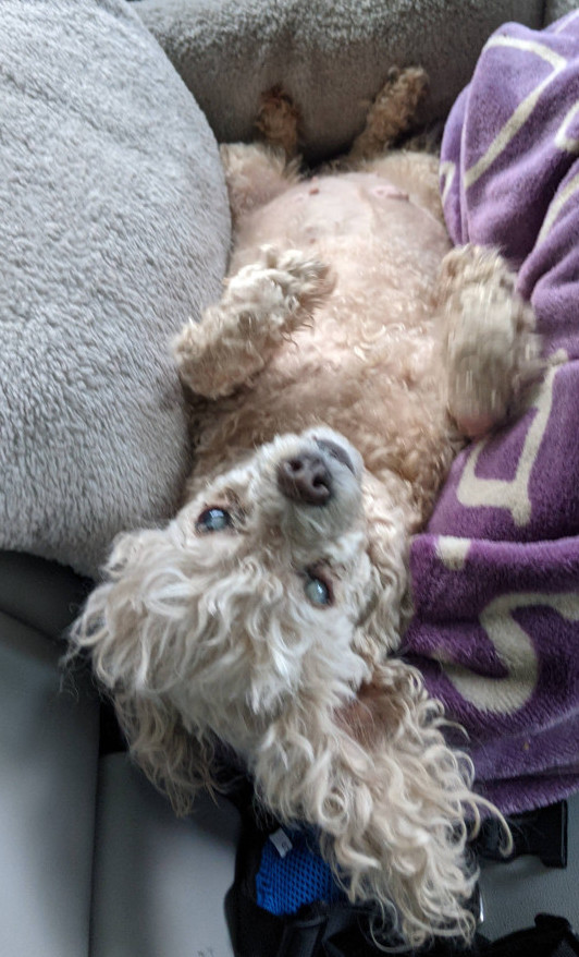 To all those praying for my dear furkid, Fire. It has taken me over a week to be able to post this. This spritely girl had been doing quite well in her fight against the cancerous tumor in her lung, giving us hope that maybe she just might be able to beat it. Of course, we knew that since it was not shrinking, it was more of a contest of how long she could continue to live happily. And she was indeed happy. Fire turned 13 years old on March 3, 2022. She had been a part of my life since birth, born to my son’s sweet little girl, Sprite and my daughter’s cute, Max. Even before being weaned, Fire was full of vim and vinegar, as they say. I named her Firecracker one day as she was chasing after even larger dogs around our yard, playing relentlessly. She was a Firecracker! When I started traveling to my Dad’s to help care for him after a stroke, Fire went along with me. She and Dad’s dog, Mickey, seemed quite content to share the time together. When we moved Dad to our home for more intense time and care, Fire still stayed close to Dad and Mickey. More of a beagle man, Dad never really appreciated poodles until he spent time with Fire. They formed a bond that was quite endearing. Mickey allowed her to have some of Dad’s attention, though he often pushed other dogs away. Maybe he sensed that she contributed some love to him, too. When Dad need hospitalization, Fire kept Mickey company. Both dogs seemed to know that his time was short and they dealt with it, perhaps a bit solemnly, but in quite good terms. Dogs seem to find the way easier than people, in many cases. A couple of years ago, Fire started coughing. A trip to the vet showed something small and strange that the vet thought might be a slight lung infection. When antibiotics didn’t cure it, we went for more intensive testing. I must admit, I was not prepared for the result. Fire had a tumor, now high in her lung. It was diagnosed as inoperable due to the location. I was devastated! Fire, however, was not one to just give up. We went through various options and decided to try chemotherapy. We have an incredible pet cancer clinic very nearby. Treatment started and we watched with great hope that the tumor might shrink enough to allow for surgery. Fire, enjoying her car seat and blanket, on another car ride! It didn’t But neither did Fire’s resolve. Fire had always been very happy and playful, even at age 12. And even cancer could not stop that. At each vet visit, I told them that as long as she was happy, we’d continue trying. And she never missed a day of happiness. Fire had always been quite obedient, true to poodle character. But with her cancer, she seemed to develop a bit of an independent streak. She was still well-behaved. But now, if she wanted to wander outside longer than we had planned, she insisted. In fact, she’d look at me when I called, then trot off her own way for a few more minutes. Not quite obedient, of course, but in a way, it seemed to help her find renewed strength to fight the growth that wanted to take her from me. (below is a picture of Josh walking Fire with an umbrella as she had just had a procedure and could not get wet--she refused to give up her wandering walks) That trend continued. If she wanted to run around in the rain, it was her choice and she let us know that. We laughed about her newfound obstinance. I often said that it was what was keeping her going. And I still think it was. As often happens with cancer, Fire’s health took a sudden turn. One day she just couldn’t seem to get cool enough, even though our home is air-conditioned. I added a fan for her, hoping to help. She was still happy and romping, but obviously having trouble getting enough air. Thursday evening during our night walk, she struggled. We did what we could for comfort, then I held her. Just after midnight (officially on Friday, June 3) she died. She didn’t struggle, she just went to sleep, on her own terms, as she had lived. No need for us to decide “it was time”. Fire had made the decision. She was tired and needed to rest. She had outlasted the “predicted” lifespan with her diagnosis by quite a bit. And she had been happy each day. What more could I ask? Sure I wanted more time with her, but it wasn’t my choice. Those of us with Furkids often talk of the “Rainbow Bridge”. I don’t know if there is such a thing or if we just reunite in heaven after a good rest. I’m fine either way. I know that Fire will be once again chasing and running with her pals and coming to me for a good snuggle. If you have furkids, spend a little extra time with them each day. Just as with people, we don’t know how many days or years they may share our lives. Make each one special. Fire made our life together very special and filled with love and happiness! (comments including a snippet of your own furkid welcome!)