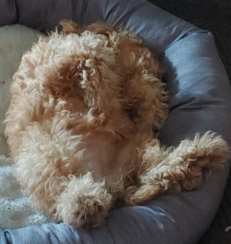 So, with my little furkid tucked into her bed for a nap, I'm back to the computer. The Golden Boys and my Marshmallow are napping right next to me. Victoria, my ruby cavalier, is stretched out on her dog bed with her sister, Artemis.