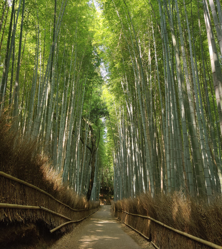 The forest is a bamboo jungle (16 square kilometers in total), with a pedestrian path that passes through several temples (Tenryu-ji) and shrines (Nonomiya Jinja) that lie at the foot of the surrounding mountains. The cooling effect of bamboo (a dense ocean of green stems) relieves some of the tremendous humidity that prevails in Kyoto in July (that I can confirm!) and August. Many choses this area for their summer retreats. Moreover, the Sagano Bamboo Forest is among the Ministry of Environment's 100 Soundscapes of Japan – an innovative effort to combat noise pollution across the country.