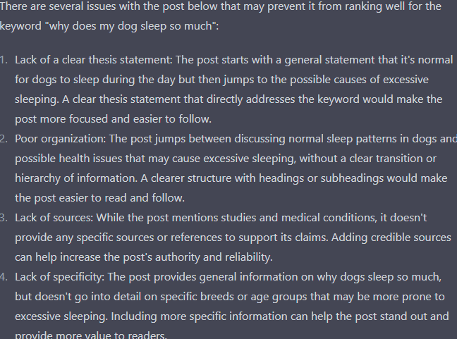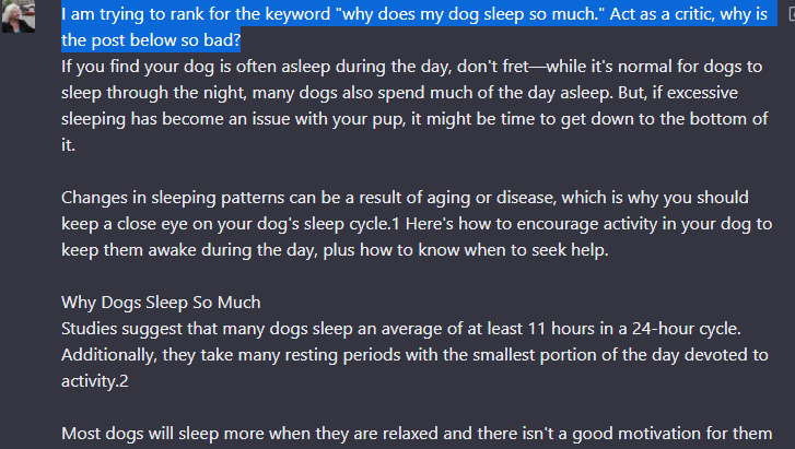 I am trying to rank for the keyword "why does my dog sleep so much?" Act as a critic, why is the post below so bad?