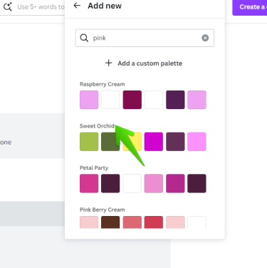 For this tutorial, I will go with simplicity and just input Pink, I like the suggestion of the Sweet Orchid palette, so just click on the name of the palette.